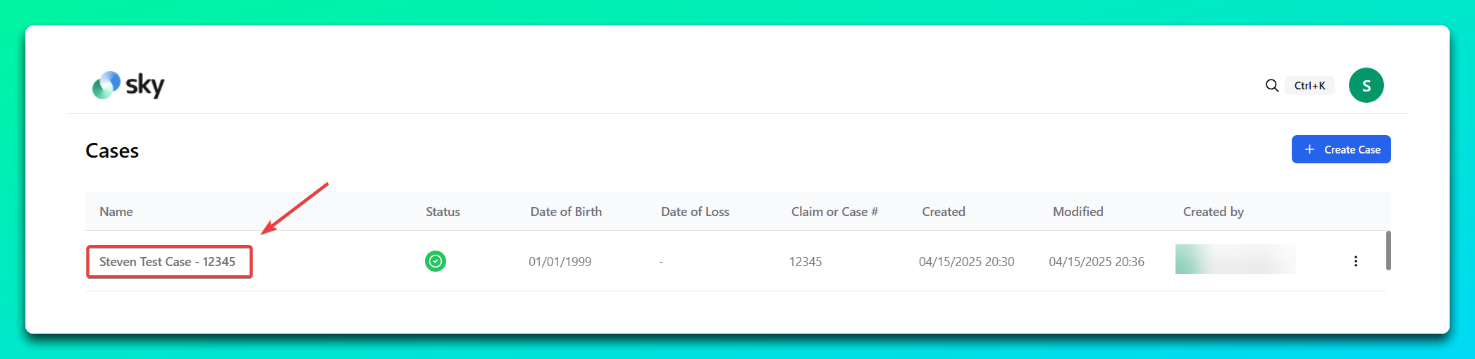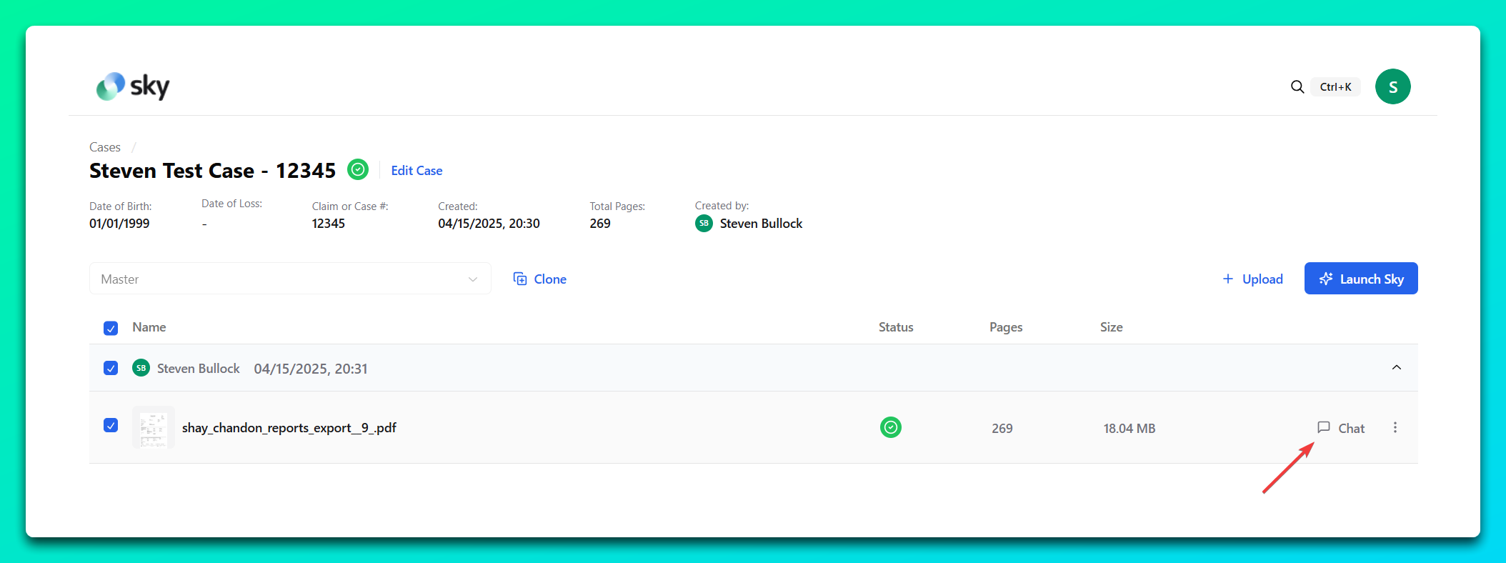 - Click the "Launch Sky" button in the top-right corner of the case page to access the detailed document view.