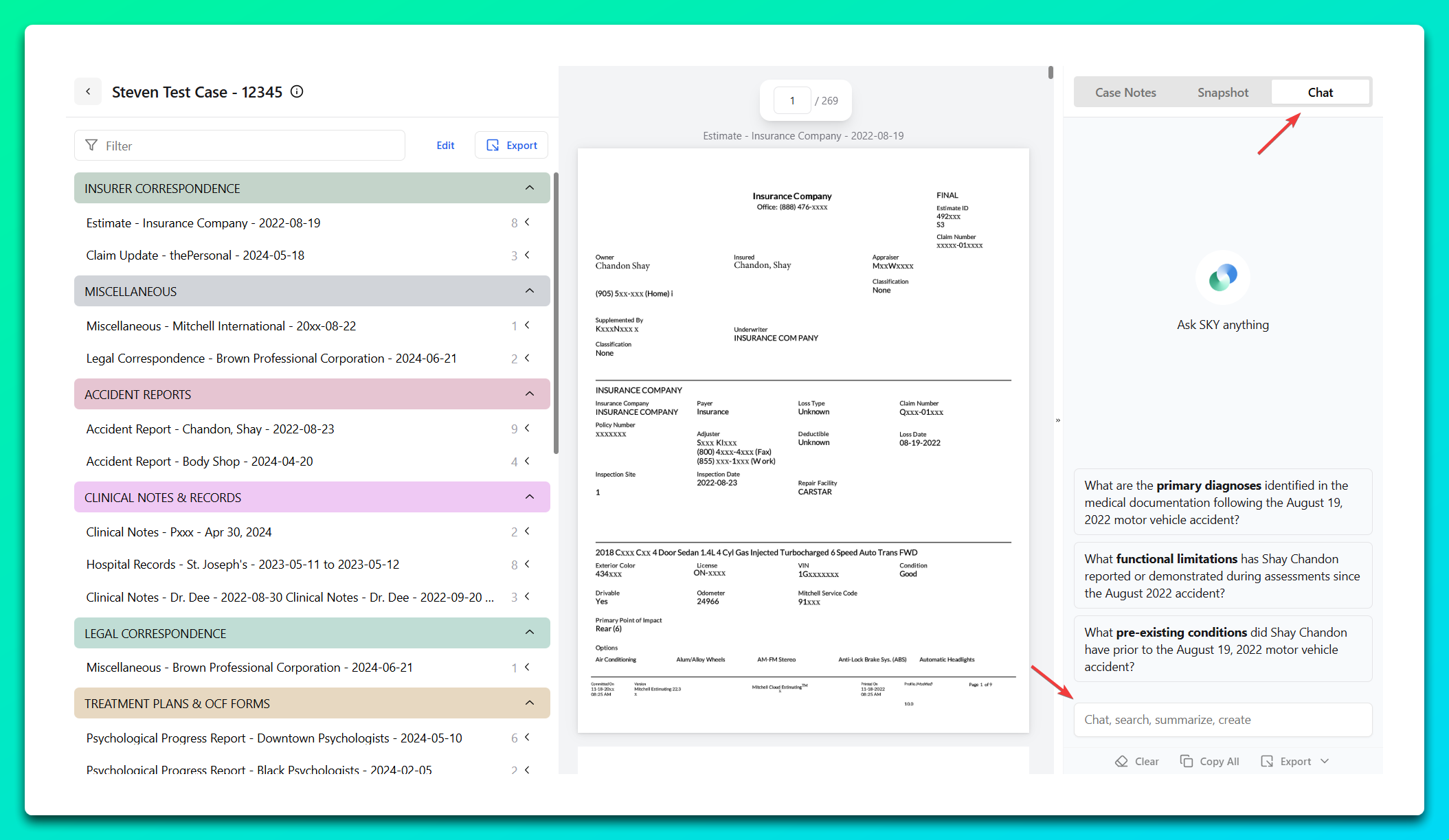 - On the right-hand panel of the Chat section, use the provided field to type any question related to the case or the selected document.