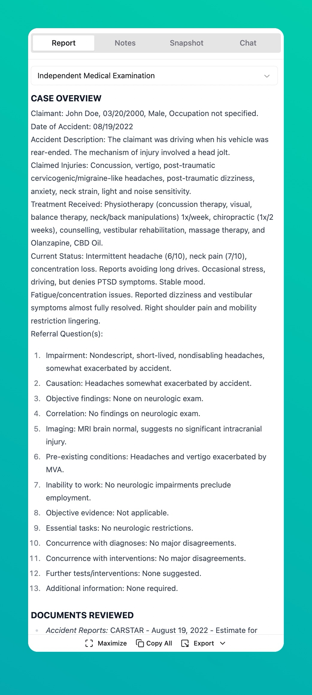 In the right-hand panel, select the tab you want to export (for example, Report, Notes, Snapshot, or Chat).