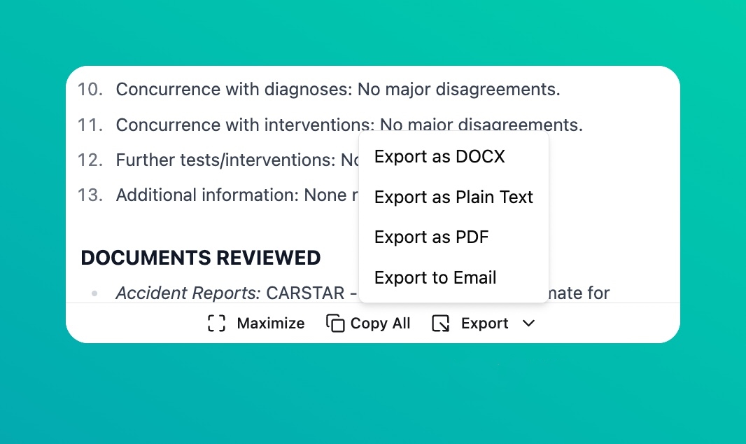 - Export to Email — send the report or note directly via email.