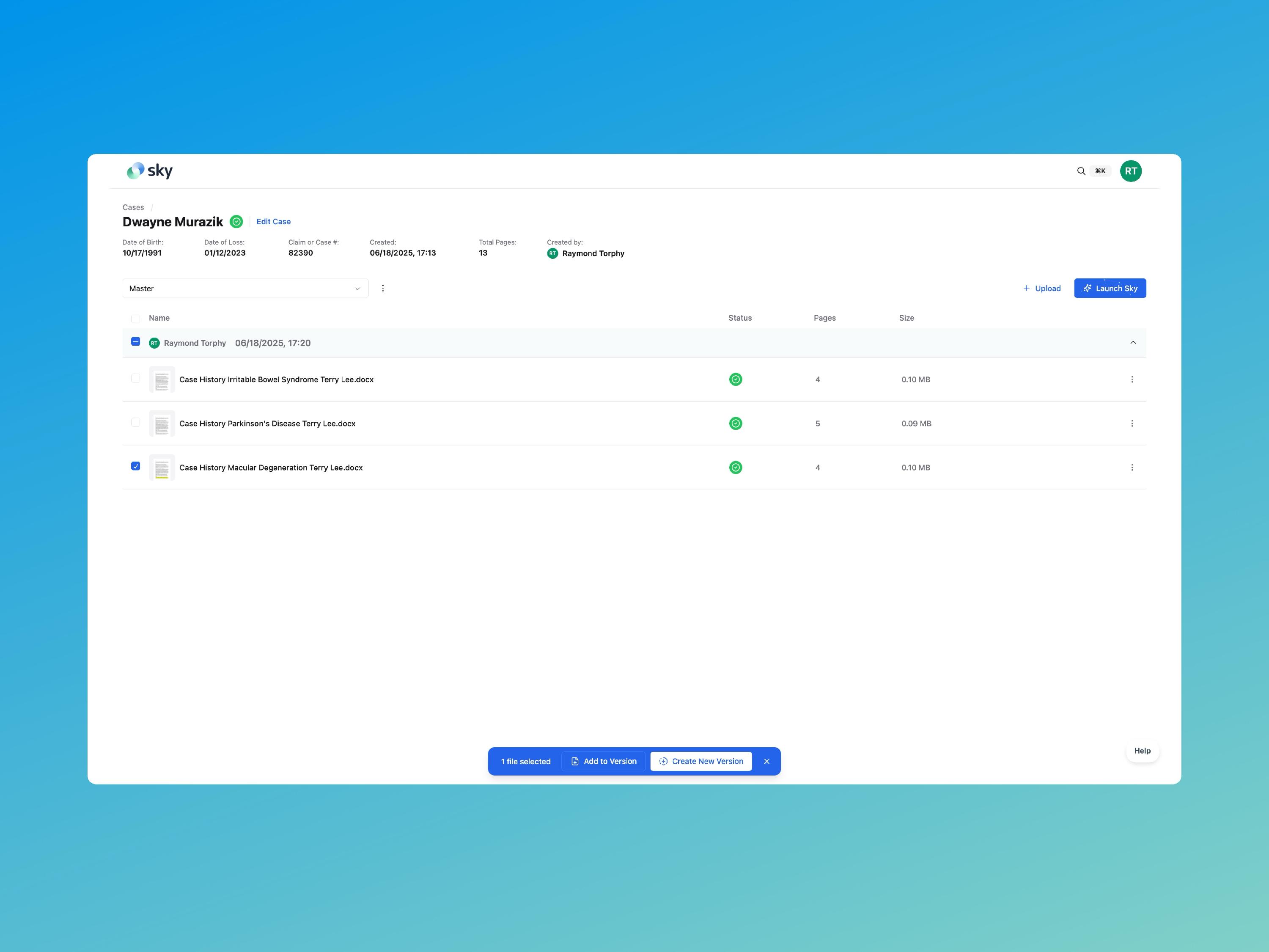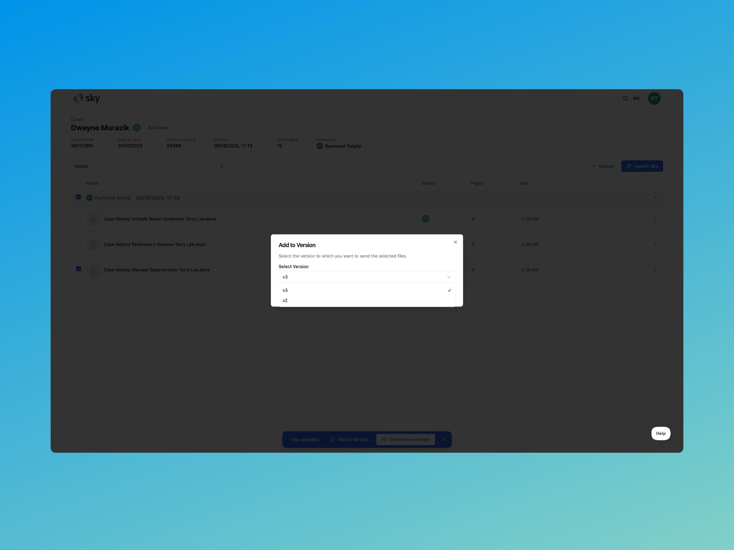 Go to your case’s document list and check the box next to the file you want to add to a version.