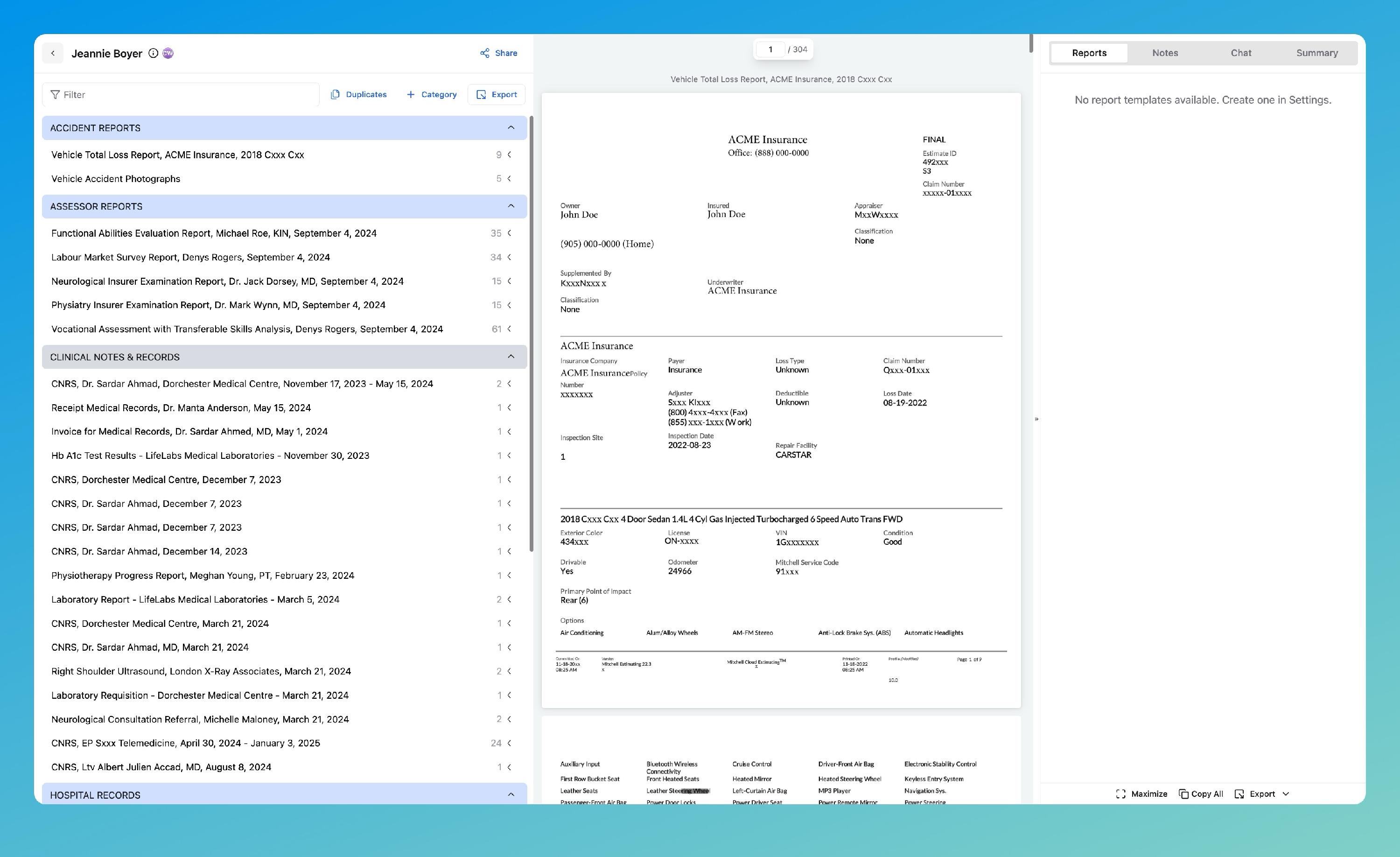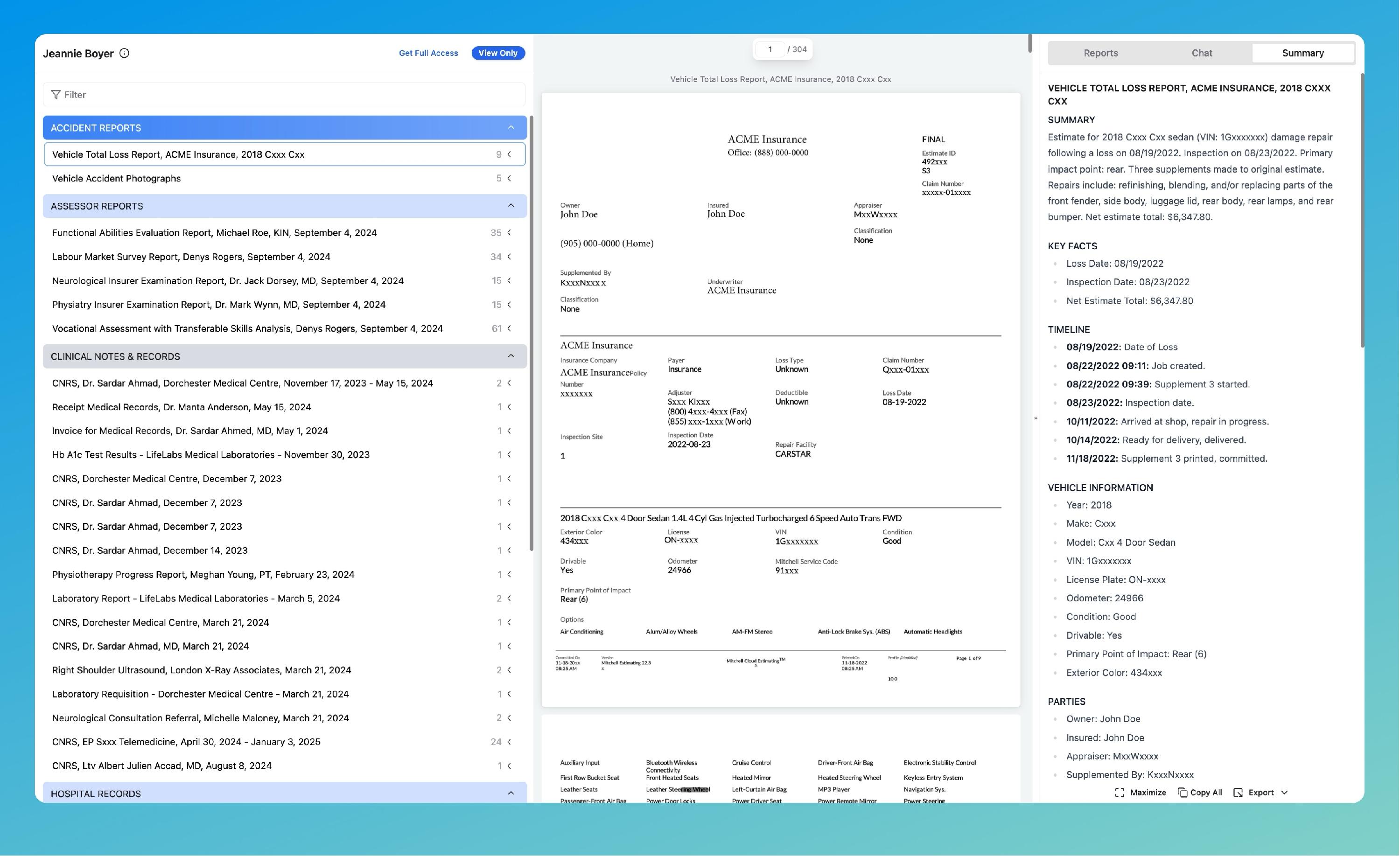 This is where all documents, categories, and AI-generated outputs for the case are available.