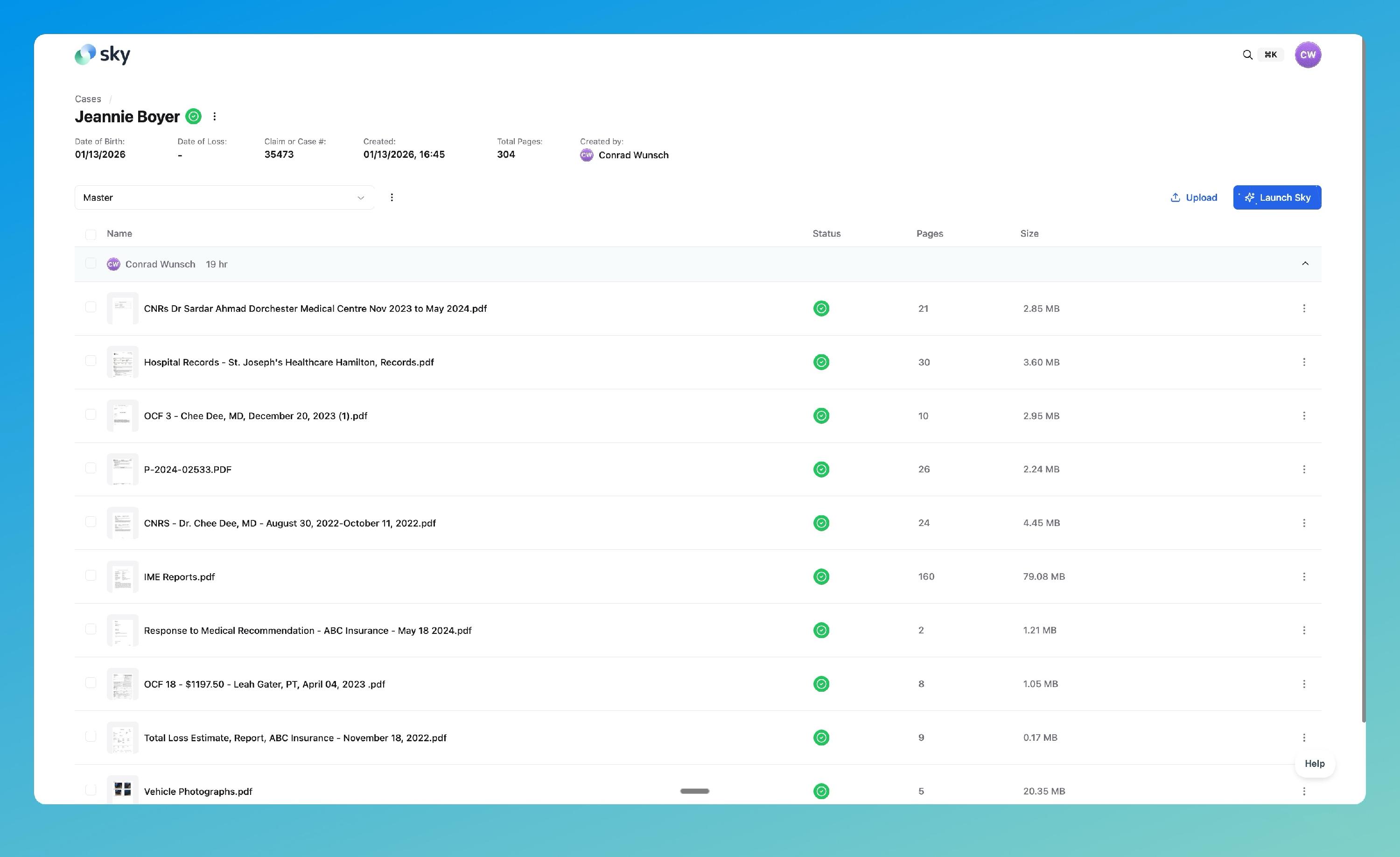 Click Launch Sky to open the document list (doclist) for the selected case.